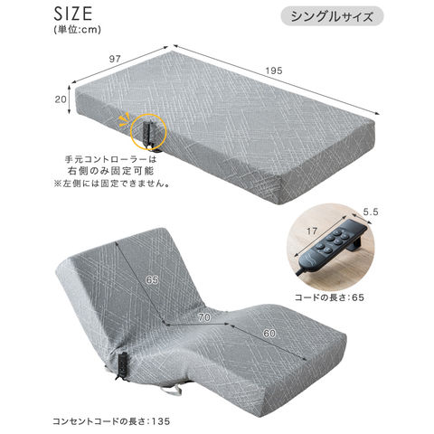 | マットレス:97×195×20cm(シングル) リモコンコード:65cm コンセントコード:135cm |