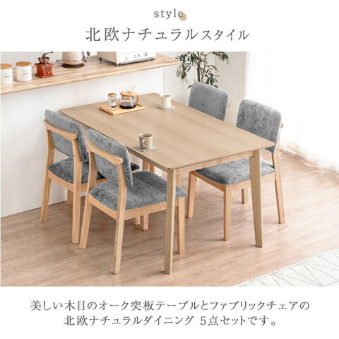 | 【おすすめポイント】 北欧カフェ風のナチュラルダイニング 5点セット <テーブル> ・はっきりした木目が美しいオーク突板天板 ・あたたかみのある優しい色合い <チェア> ・長時間座っても快適なクッション座面&背もたれ ・光沢あるおしゃれなファブリック生地 |