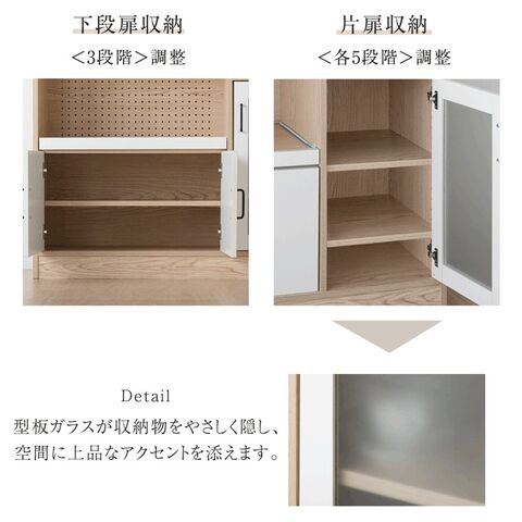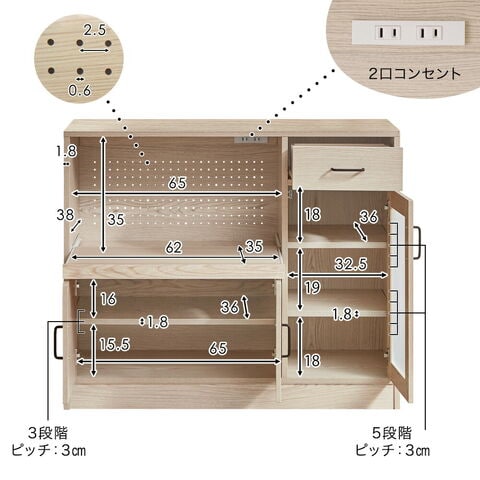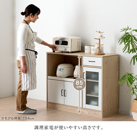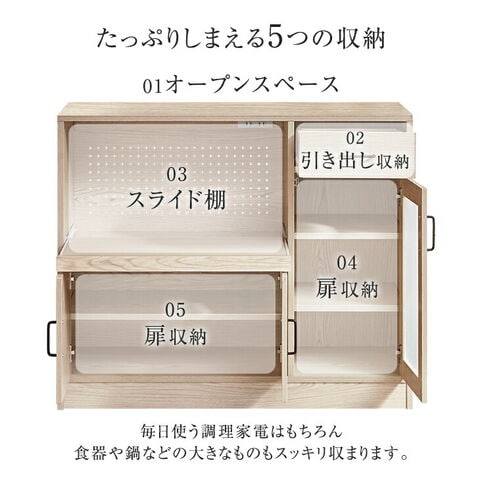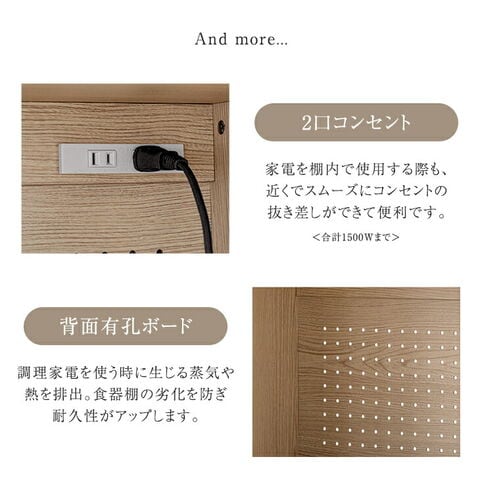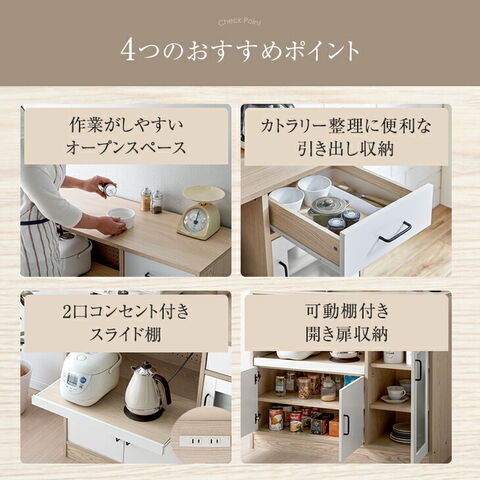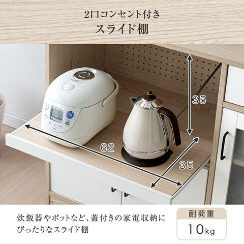 ・食器やストックをすっきり整頓 ・置くものに合わせて調節 可動棚 ・蓋付き家電の収納にぴったりなスライド棚 ・2口コンセント付き |