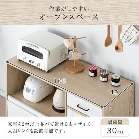 キッチンカウンター 幅103 引き出し コンセント付き レンジ台 キッチンラック キッチンボード カウンター 食器収納 大型レンジ対応 スライド 木目 おしゃれ 北欧 33020030〔ホワイト×シャビーアッシュ〕