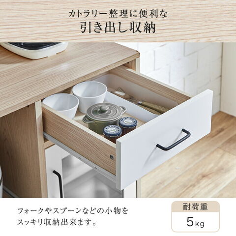 | 耐荷重 | 天板:約30kg スライド棚:約10kg 下段扉収納:約10kg 片扉収納:約10kg 各可動棚:約5kg 引出:約5kg |