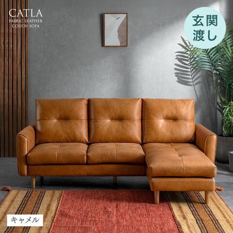 ヴィンテージ調 カウチソファ ファブリックレザー 左右変換OK コーナーソファ L字ソファ ブリックレザーソファ 天然木 脚付き 3人掛け 北欧 おしゃれ 玄関渡し【超大型】33020035〔キャメル〕