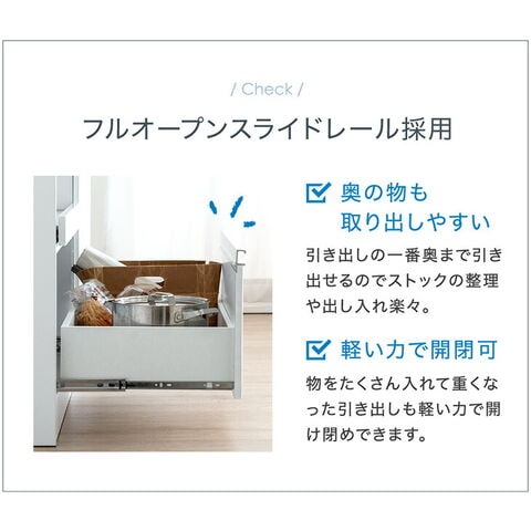 | 素材 | 前板: ホワイトウッド・ホワイト…ハイグロスシート(PVC) オーク×グレージュ…強化シート オープン収納・スライド棚天板: ホワイトウッド・ホワイト…ポリ化粧繊維板 オーク×グレージュ…強化シート 引き出し内部: 垣板・手前板・向板…PVC化粧繊維板 底板…プリント化粧繊維版 取っ手:プラスチック |