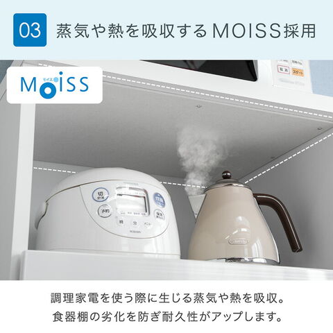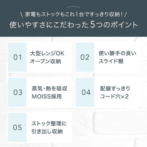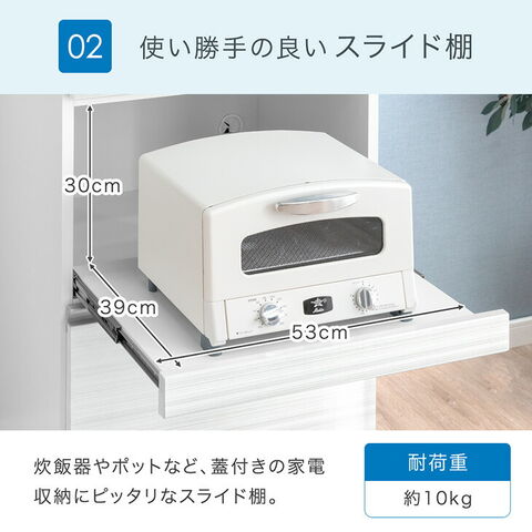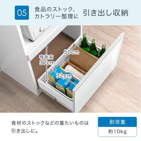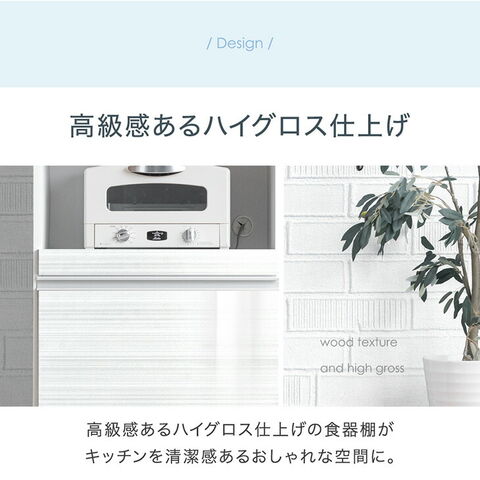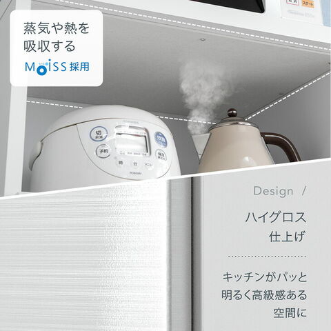 ・食器やストックをすっきり整頓 ・蓋付き家電の収納にぴったりなスライド棚 ・蒸気や熱を吸収するモイス付き ・引き出しは奥の物も取り出しやすいフルオープンスライドレール使用 ・選べる2タイプ ┗清潔な印象のホワイトウッド、ホワイト 高級感あるハイグロス仕上げ ┗あたたかみある木目調のオーク×グレージュ 上品なマット仕上げ ・日本一の家具産地 大川産 |