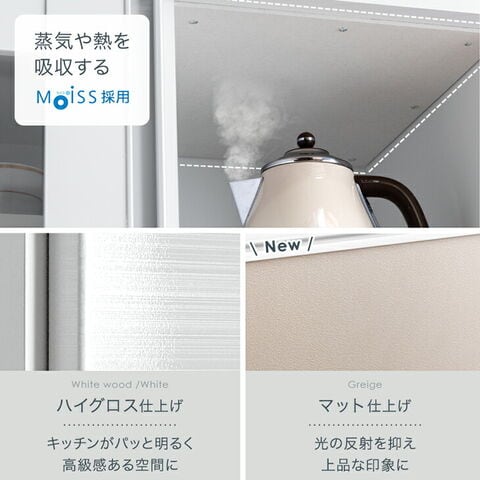 ・食器やストックをすっきり整頓 ・蓋付き家電の収納にぴったりなスライド棚 ・蒸気や熱を吸収するモイス付き ・引き出しは奥の物も取り出しやすいフルオープンスライドレール使用 ・置くものに合わせて調節 可動棚 ・選べる2タイプ ┗清潔な印象のホワイトウッド、ホワイト ┗あたたかみある木目調のオーク×グレージュ 上品なマット仕上げ ・日本一の家具産地 大川産 |