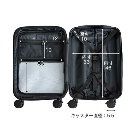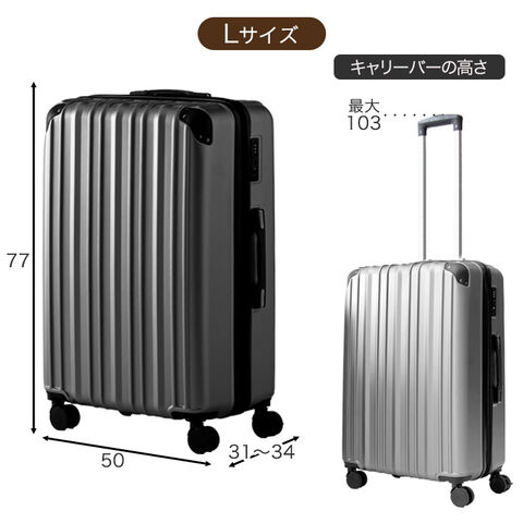 (3辺合計サイズ:113~116cm) ケース内寸(右):46×33×深さ10cm ケース内寸(左):46×33×深さ10~13cm キャスター直径:5.5cm 重量:約2.5kg ■Mサイズ 外寸:幅43×奥行27~30×高さ67cm (3辺合計サイズ:137~140cm) ケース内寸(右):57×39×深さ10cm ケース内寸(左):57×39×深さ10~13cm キャスター直径:5.5cm ※機内持ち込み不可 重量:約3.5kg ■Lサイズ 外寸:幅50×奥行31~34×高さ77cm (3辺合計サイズ:158~161m) ケース内寸(右):67×45×深さ13cm ケース内寸(左):67×45×深さ13~16cm キャスター直径:5.5cm ※機内持ち込み不可 重量:約4.5kg |
