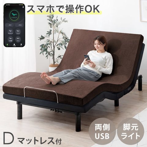 スマホで操作OK 電動ベッド ダブル 高反発 マットレス 付 USBポート 目覚し機能 足元照明LED付 リクライニングベッド リクライニング ベッド ウレタン 4190003310〔マットレス:ブラウン(パイル)〕
