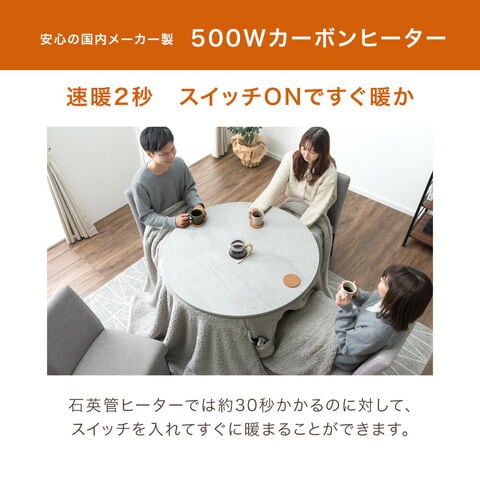 ・無段階昇降でピッタリの高さに調節可能! ・選べる3種類の天板 └温かみのあるライトブラン └モダンなモルタルグレー └お部屋が明るくなるナチュラル ・自由な位置に座れる円形 ・速暖カーボンヒーターこたつ ・操作しやすい手元コントローラー ・確かな品質、クレオ工業製ヒーター |