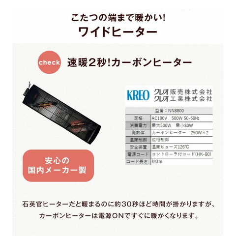 | クレオ工業製 カーボンヒーター 品番:NN8800 消費電力:500W 温度調節:手元電子コントロール式 発熱体:カーボンヒータ×2灯 コード長さ:3m |