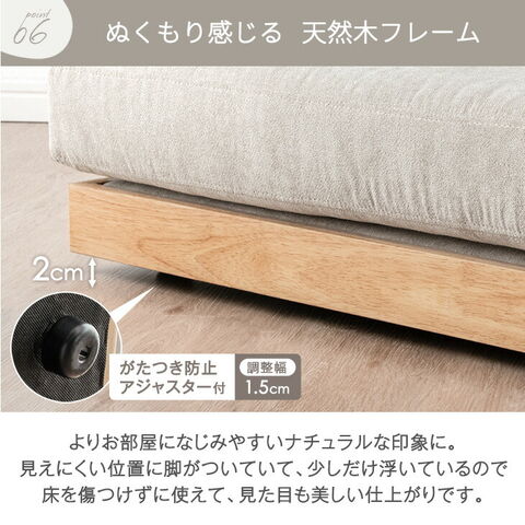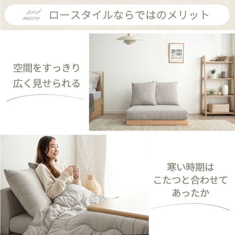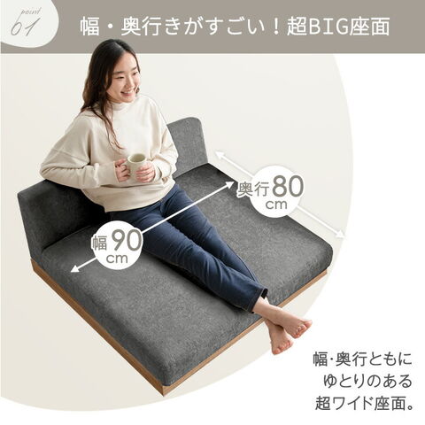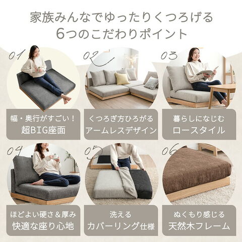 ・快適&高耐久ポケットコイル入り ・洗えるカバーリングフロアソファ ・圧迫感がなくお部屋を広く見せるロータイプ ・奥行きがすごい!超BIG座面 ・レイアウト自由自在 アームレスデザイン ・家族が増えても連結して長く使える ・体をしっかり支える かための座り心地 ・シリコンフィルをたっぷり使った ふわふわクッション ・体勢を変えてもずれにくい 座面ずれ防止テープ ・オールシーズン快適 ファブリック ・ぬくもり感じる 天然木フレーム ・防虫効果のあるユーカリ材使用 ・脚付きだから床を傷つけずに使える ・がたつき防止 アジャスター付き ・クッション2個セット |