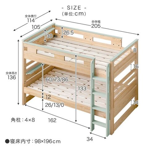 総外寸:幅114×奥行205×高さ136cm シングル時外寸:幅105×奥行205×高さ90cm 寝床:98×196cm スノコ厚み:1.5cm |