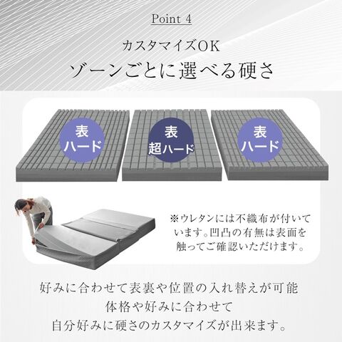 ・体をしっかり支える 超極厚20cm厚 ・あらゆる寝姿勢にフィットする3層構造 ・あなた好みにカスタマイズOK! ・腰をやさしく支える高反発マットレス ・不純物を含まず、においを軽減させた純高反発(R) ・反発弾性までしっかり検査した高品質ウレタン ・ウレタンは消臭効果のある竹炭入り ・カバーは世界基準の安全性 エコテックス認証生地 ・収納やお手入れに便利な3つ折りタイプ ・ISO9001認可工場での生産 ・着脱しやすいU字ファスナー |
