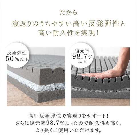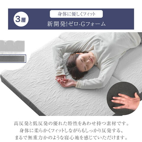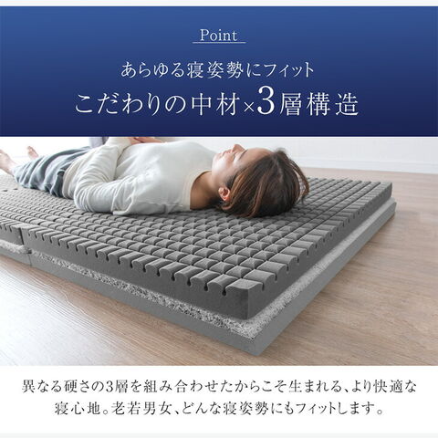 ・ワンランク上の寝心地 3層マットレス ・不純物を含まず、においを軽減させた純高反発(R) ・反発弾性率50%で寝返りがうちやすい ・理想の寝姿勢を保つ優れた体圧分散性 ・反発弾性までしっかり検査した高品質ウレタン ・ウレタンは消臭効果のある竹炭入り ・へたりにくく高耐久 ・通気性抜群で蒸れにくい ・カバーは世界基準の安全性 エコテックス認証生地 ・床敷きでも使えるしっかり厚み10cm ・収納やお手入れに便利な3つ折りタイプ ・ISO9001認可工場での生産 ・着脱しやすいU字ファスナー |