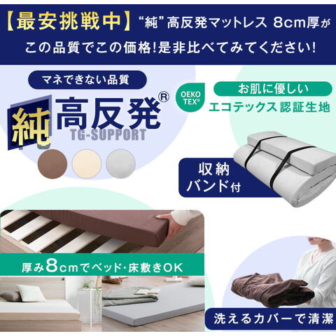 【即納】 「純」 高反発 マットレス 厚さ8cm シングル 収納バンド付 170N 超低ホル エコテックス認証 マット 高反発マットレス マットレス 敷布団 敷き布団 高反発 高反発マット 43310053 〔ライトグレー〕