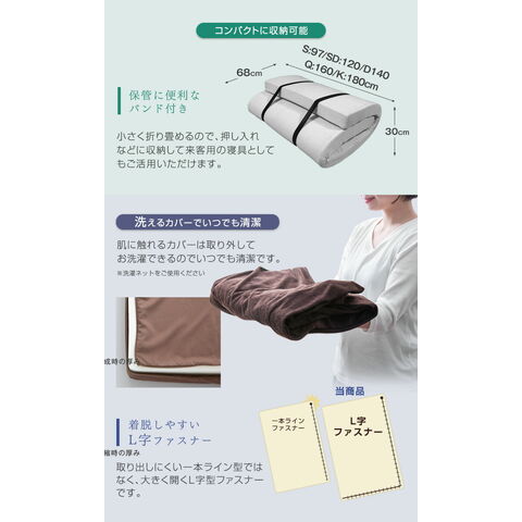 | 【中国製】【洗濯OK(カバーのみ)】 ※配送は全て宅配便(1人)での玄関渡しとなります。 ※マットレスは約1~2日で復元します。気温や温度により3~14日かかる場合もあります。 ※圧縮梱包のマットレスについて、ウレタンフォームの感温性(反発弾性フォームは温度が高くなると柔らかくなり、低くなると硬さが高くなる性質)により冬場、寒いところで復元させると、復元に時間がかかります。又、部分的に復元するタイミングが異なる場合がございます。室温が18度以上の部屋に半日くらいおくと、回復がしやすくなります。 ※開封時の臭いは新品のウレタン特有のもので無害です ※生産過程でウレタンフォームの重量に若干の個体差が生じる場合があります。 ※当商品は圧縮梱包を採用しています。開封時の膨張によりカバーのファスナーが破損することを防ぐため、あらかじめ10cmほどファスナーを開けています。開封後はお手数ですがファスナーを閉めてご使用ください。 |