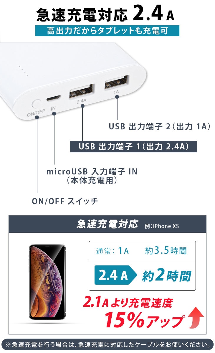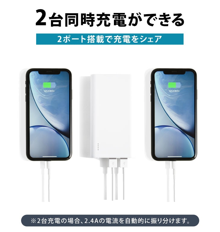 モバイルバッテリー 10000mAh 違いは2.4Aで急速充電! 2.1Aより速度15%UP! コンパクト 大容量 10000 mAh 2.4A 軽量 210g 充電 充電器 スマホ iPhone iPad android バッテリー 2USB 防災 45200005