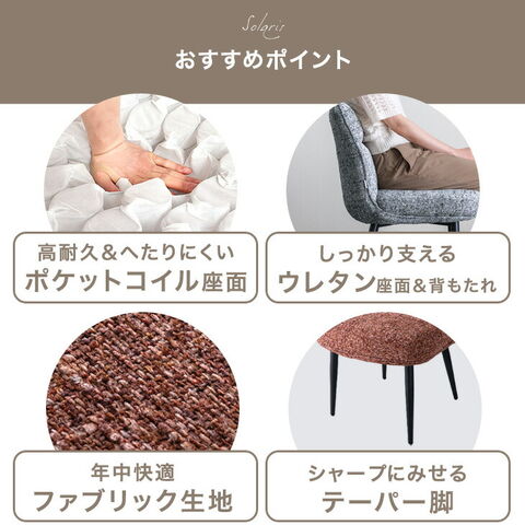 ・ボリュームたっぷりクッション座面/背もたれ ・身体にフィットする背もたれカーブ ・張地は選べる2タイプ -年中さらっと快適ファブリック生地 -水や汚れに強い ・スタイリッシュなスチール脚 |