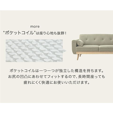| 張地:ポリエステル 中材:ウレタンフォーム、ポケットコイル(25個) 脚部:スチール |