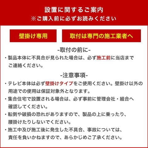 | 備考 | 【完成品(取付けは専門業者)】【後払い・時間指定不可】 ※配送は全て宅配便(1人)での玄関渡しとなります。大型商品や重量商品、エレベーターの無い2階以上にお住まいのお客様は、玄関口までの搬入をお手伝いをお願いしております事をご了承ください。 ※超大型商品となり配送が特殊な為、後払い及びお時間の指定が出来ません。誠に申し訳ございませんが、お客様のご理解とご協力をお願い致します。 ※商品ページの色味は、出来る限り実物に近い色で画像を掲載しておりますが、お使いのブラウザー及びモニターや使用環境により、実際の色と多少の差異があります。予めご了承ください。 【注意事項】 ・テレビ本体は必ず壁掛けタイプをご使用ください。壁掛け以外の用途での使用は保証対象外となります。 ・集合住宅で設置される場合は、必ず事前に管理会社・組合へ確認してください。 ・転倒や破損の恐れがありますので、製品の上に乗ったり、腰掛けたりしないでください。 ・施工中及び施工後に発生した不具合、事故については、責任を負いかねますので、あらかじめご了承ください。 | |