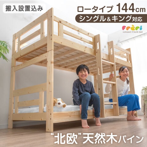 【搬入設置込み】木製 2段ベッド シングル 耐荷重500kg ロータイプ 144cm パイン材 はしご 新生活 二段ベッド 二段ベット 新入学 キング【超大型】 99900155〔ナチュラル〕