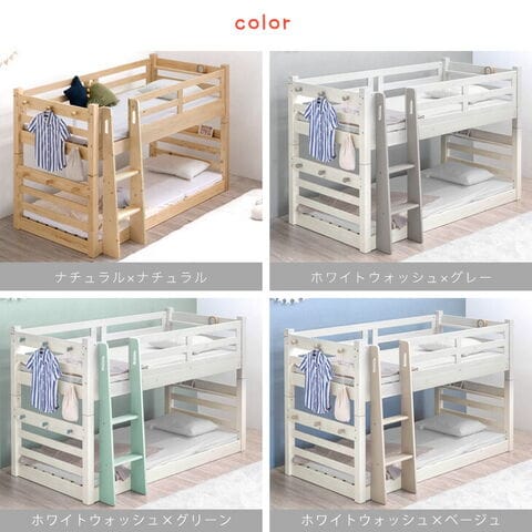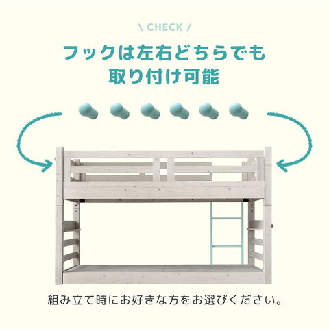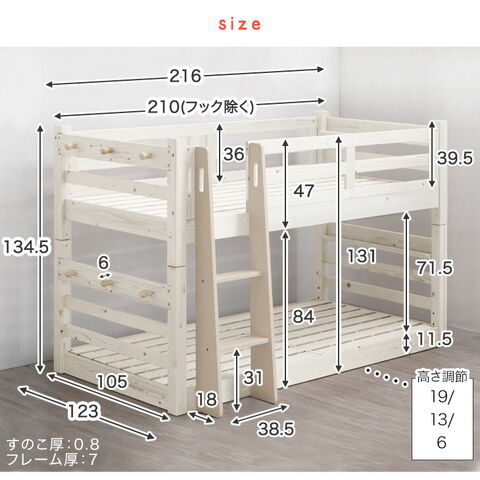 | 外寸:幅123×長さ216×高さ134.5cm 床板部内寸:98×196cm 支柱の太さ:7×7cm 柵の厚み:2cm 上下段床下高さ4段調整: ・1段目:約0cm ・2段目:約6cm ・3段目:約13cm ・4段目:約19cm ※2段ベッドとして使用時は、下段のみ高さ調整できます。上段は高さ調整できません。 |