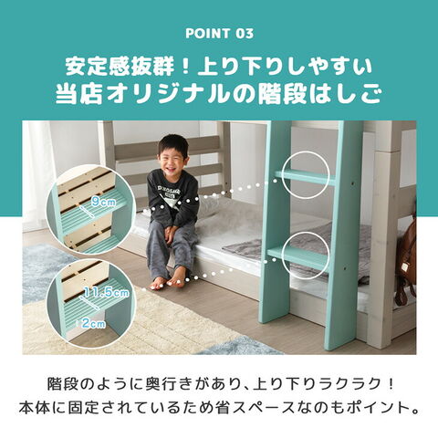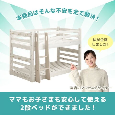・現役ママが考えた安心、安全の二段ベッド ・上下段に連結ダボと連結ビスをロックし耐震性アップ! ・高さ36cmの安全フレームで転落防止 ・安定感抜群の超極太70mm角柱使用 ・上りやすい当店オリジナル階段はしご ・はしごは左右取り付けOK ・丸みを帯びた丁寧な仕上げ ・暖かみのある天然パイン材 ・上下段を分けてシングルベッドとしても使用可能 ・横につなげるとキングサイズベッドに ・左右どちらにも付けれるフック6個 ・ベッド下フレームは4段階高さ調節OK ・子供にも安心・安全のFフォースターランクの塗料を使用 |