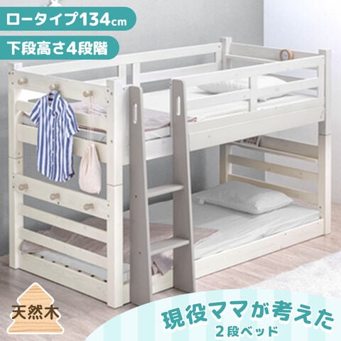 現役ママが考えた 下段高さ4段階 二段ベッド 左右はしご対応 ロータイプ 天然木 134cm シングル キング お掃除ロボット対応 高さ調節 階段 分割可能【超大型】49600080〔ホワイトウォッシュ×グレー〕