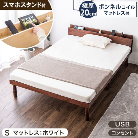【即納】 ベッドマットレス付き シングル 3段階 高さ調節 USBポート 2口コンセント スマホスタンド 宮棚 ブックシェルフ付 すのこ 天然木 ボンネルコイル マットレス 20cm厚 収納 木製 北欧 49600125 〔ベッド:ブラウン【マット:ホワイト】〕