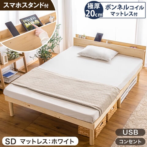 【即納】 ベッド マットレス付き セミダブル 3段階 高さ調節 USBポート 2口コンセント スマホスタンド 宮棚 ブックシェルフ付き すのこベッド 天然木 ボンネルコイル マットレス 収納 木製 北欧 49600126 〔ベッド:ナチュラル【マット:ホワイト】〕