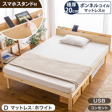 【即納】 ベッド マットレス付き ダブル 3段階 高さ調節 USBポート 2口コンセント スマホスタンド 宮棚 ブックシェルフ付き すのこベッド 天然木 ボンネルコイル マットレス 収納 木製 北欧 49600127 〔ベッド:ナチュラル【マット:ホワイト】〕