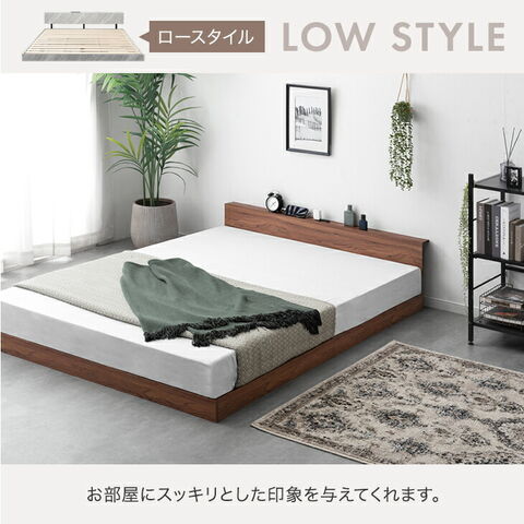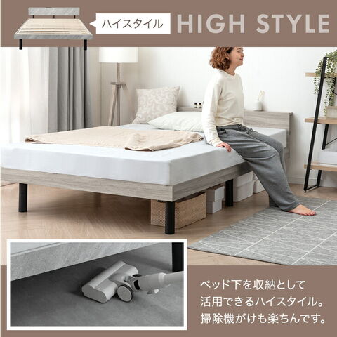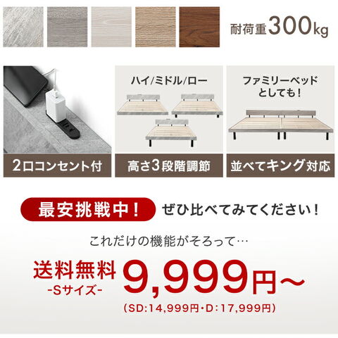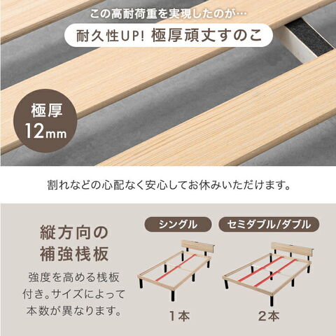 ・枕元に小物を置ける宮棚付き ・スタイルに合わせて選べる高さ3段階 ・選べる5色展開 ・寝ている間にスマホの充電が可能なコンセント2口付き ・ほこりが入りにくいスライド式コンセント ・通気性抜群のすのこ仕様 ・本体と脚用にそれぞれ傷防止フェルト付属 ・2台を隙間なくぴったり並べてキングサイズに |