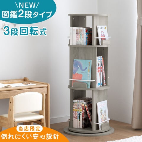 【即納】 <倒れにくい安心設計> 回転絵本ラック 3段 図鑑2段タイプ 図鑑対応 絵本棚 収納 本棚 回転本棚 絵本ラック 回転ラック 回転式本棚 回転式 大容量 子供部屋 子供用 絵本 図鑑 おしゃれ 49600375〔アッシュグレー〕