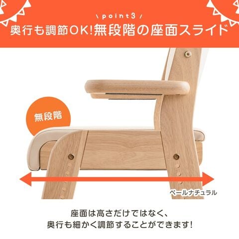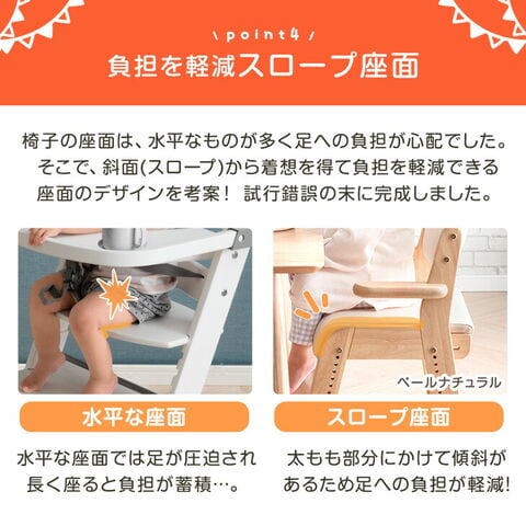 ・新開発!お掃除ロボット対応 ハイチェア ・お子さまの体格に合わせて細かく調節OK -座面:10段階/足置き:13段階/座面奥行き:無段階 ・足の負担を軽減 スロープ座面 ・あたたかみのある天然木 ・安心の角丸デザイン |