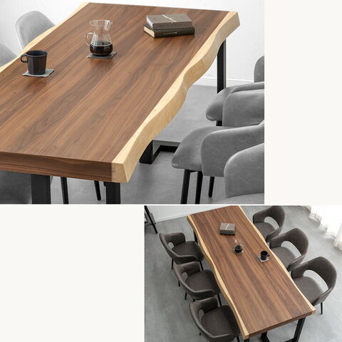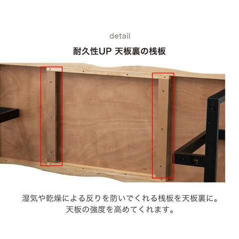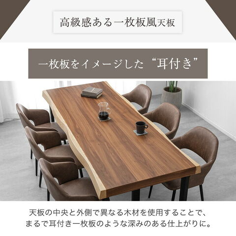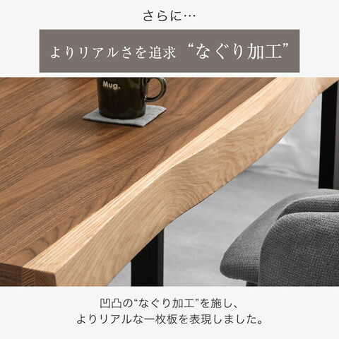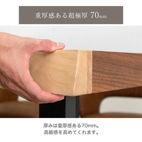 ・一枚板のような高級感を演出する“耳付き&なぐり加工”天板 ・重厚感を生む極厚70mm天板 ・スタイリッシュなブラック脚 ・ガタ付きを防ぐアジャスター付き |