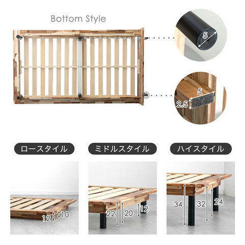 個性的な木目が美しいアカシアステージベッド ・お好みに合わせて高さ3段階調整 …お部屋が広く見える ロースタイル …お掃除ロボット対応 ミドルスタイル …収納スペースを生み出す ハイスタイル ・ちょっとした物が置ける ステージ ・通気性抜群のすのこ素材 ・しっかり支える耐荷重200kg |