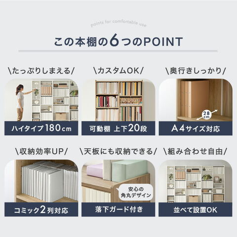 ・たっぷりしまえる ハイタイプ180cm ・細かな調整で無駄なくしまえる可動棚 ・奥行しっかり!A4ファイル対応 ・コミックサイズなら前後2列OK! ・天板まで使いやすい 落下ガード付き ・どんなお部屋にも置きやすいシンプルデザイン ・選べる4サイズ ・壁に固定できる転倒防止金具付き ・ネジ穴隠しシール付き |