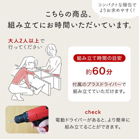 | 備考 | 【組立品】(1台あたり大人2人で約60分)、プラスドライバー付属 ※配送は全て宅配便(1人)での玄関渡しとなります。大型商品や重量商品、エレベーターの無い2階以上にお住まいのお客様は、玄関口までの搬入をお手伝いをお願いしております事をご了承ください。 ※傾斜や段差などがある不安定な場所では使用しないでください。 また、カーペットや畳などの柔らかい床での取り付けもお控えください。 ※シャビーオークのカラーについては、木目に交差する光の筋のような模様がございます。こちらはオーク材などにみられる虎斑を再現したもので仕様となります。 ※商品の棚に乗ったり、踏み台としての使用はお控えください。 |