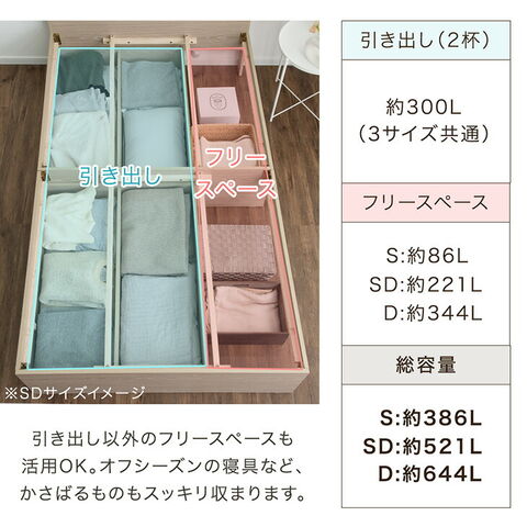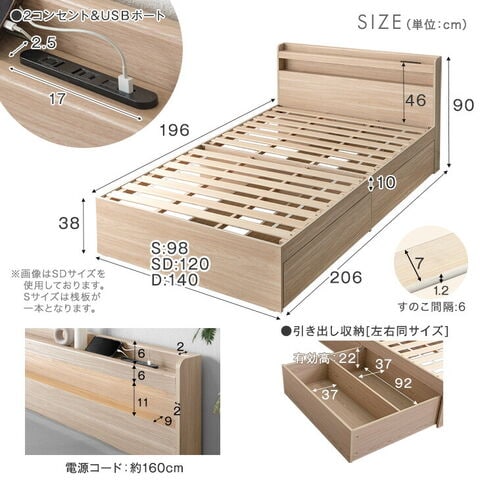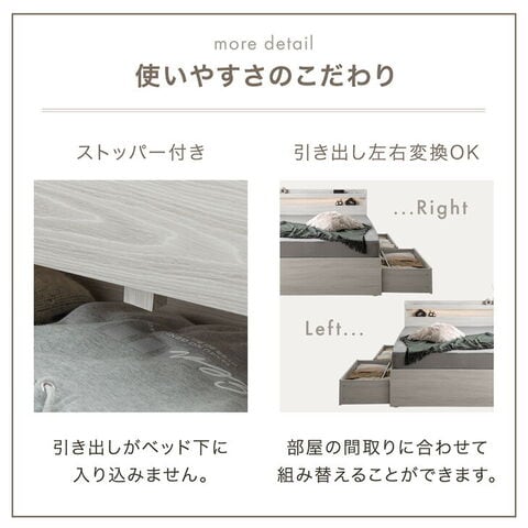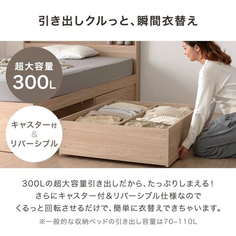 ・たっぷりしまえる約300Lの引き出し収納 ・ラクラク衣替え!リバーシブル引き出し ・お部屋に合わせて左右変換OK ・オールシーズン快適すのこ ・すのこを立てて簡単布団干し ・枕元を優しく照らすライト付き ・スマホスタンド&USB+2口コンセント付き宮棚 ・コンセント/USBはほこりが入りにくいスライド式 |