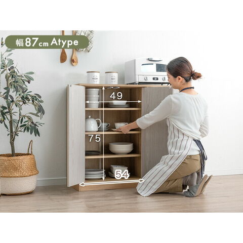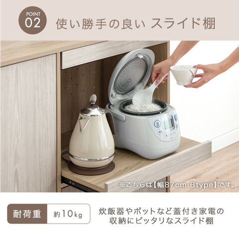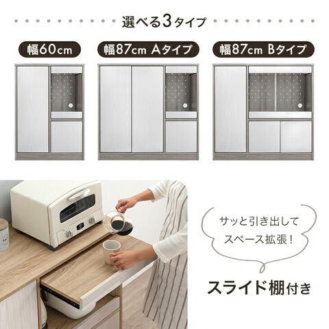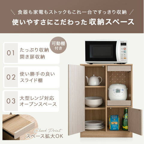 ・食器やストックをスッキリしまえる扉付き ・キッチンのスペースや収納するものに合わせて選べる3タイプ ・便利なスライド棚×2 ┗上段:サッと引き出して作業スペース拡張 ┗下段:炊飯器やポットなどの収納に ・下段スライド棚の背面は通気性の良い有孔ボード ・マグネットでしっかり締まるプッシュ式扉 ・置くものに合わせて調節OK 可動棚 ・無駄のないシンプル&スリムなデザイン |
