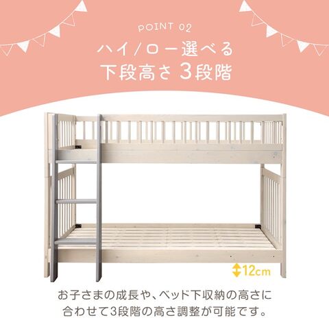 ・おしゃれな格子デザイン ・ぬくもり感じる天然木 ・顔が見えるロータイプ140cm ・上下段を分けてシングルベッドとしても使用可能 ・高さ3段階調整OK ・左右組み替えOK スリムな垂直はしご ・安心の耐荷重300kg ・通気性抜群のすのこ床板で年中快適 ・4分割すのこでお掃除ラクラク |
