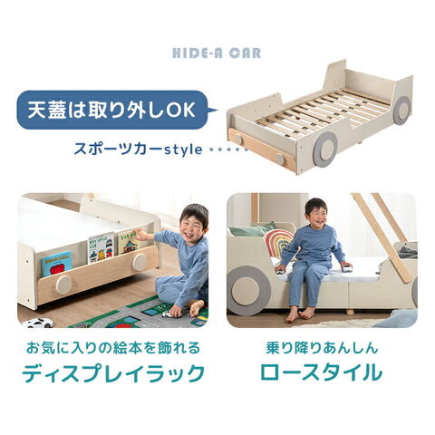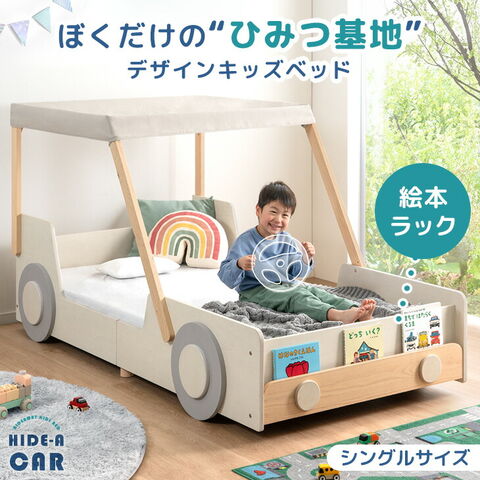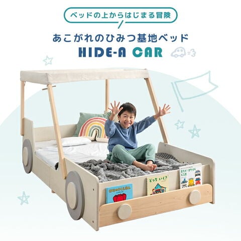 眠るのが楽しみになる あこがれの“ひみつ基地”ベッド HIDE-A CAR ・おもちゃの車みたいなかわいいデザイン ・お気に入りの絵本を飾れるディスプレイラック付き ・乗り降りあんしんロースタイル ・天蓋を取り外せばスポーツカースタイルに! ・ぬくもり感じる天然木使用 ・通気性抜群のすのこ床板で年中快適 ・安心の低ホルムアルデヒド 子どものための“あこがれの秘密基地ベッド”シリーズ、HIDE-A(ハイドエー)。 自分だけの場所を持つことは、子どもが自立していく第一歩。 海外で人気のテーマベッドを、日本の暮らしに合わせて設計しました。ベッドの上からはじまる冒険と自立。 HIDE-Aシリーズは、お子様の眠りと成長をサポートします。 |