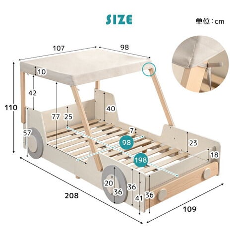 | サイズ | 外寸:幅109cm×奥行208cm×高さ110cm ベッド内寸:幅98×奥行198cm |