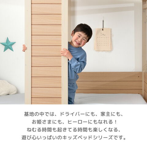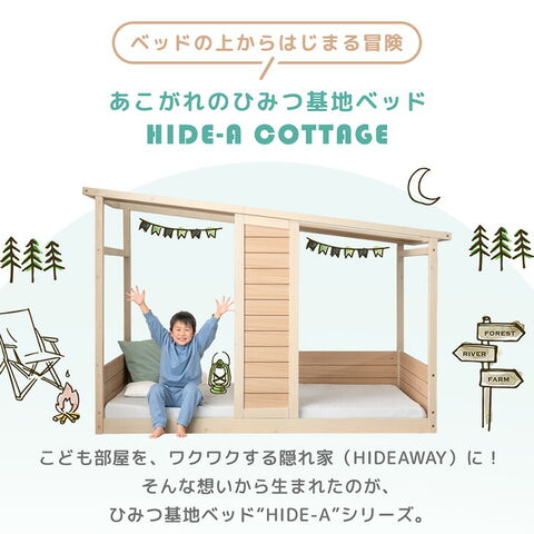 あこがれの秘密基地ベッド HIDE-A COTTAGE ・ぬくもり感じる天然木 ・お子さまも安心のロースタイル ・通気性抜群のすのこ床板で年中快適 ・安心の低ホルムアルデヒド 子どものための“あこがれの秘密基地ベッド”シリーズ、HIDE-A(ハイドエー)。 自分だけの場所を持つことは、子どもが自立していく第一歩。 海外で人気のテーマベッドを、日本の暮らしに合わせて設計しました。ベッドの上からはじまる冒険と自立。 HIDE-Aシリーズは、お子様の眠りと成長をサポートします。 |