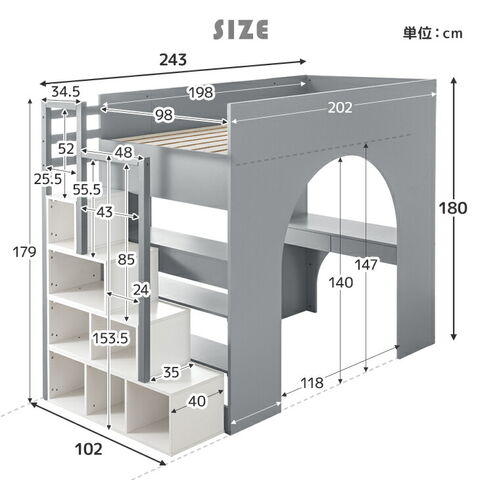 | 備考 | 【組立品(大人2人で約3時間半)】【後払い・時間指定不可】 ※配送は全て宅配便(1人)での玄関渡しとなります。大型商品や重量商品、エレベーターの無い2階以上にお住まいのお客様は、玄関口までの搬入をお手伝いをお願いしております事をご了承ください。 ※階段以外の場所から寝台部に登らないでください。怪我や破損の危険性があります。またご使用前に使用者への注意をお願いいたします。 ※商品ページの色味は、出来る限り実物に近い色で画像を掲載しておりますが、お使いのブラウザー及びモニターや使用環境により、実際の色と多少の差異があります。予めご了承ください。 |