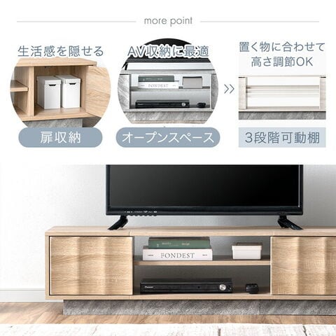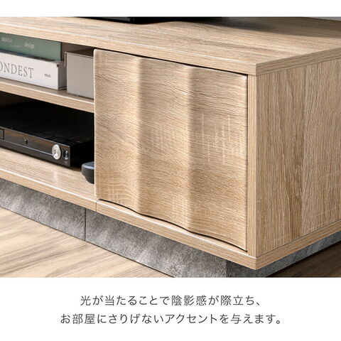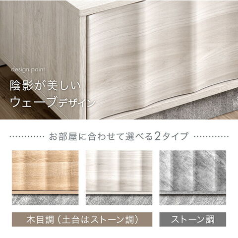 ・陰影が美しいウェーブデザイン ・生活感を隠せる扉付き収納 ・置く物に合わせて調節OK 3段階可動棚 ・お部屋に合わせて選べる2タイプ …落ち着いた色味&ツートン仕様の木目調 …スタイリッシュなストーン調 |
