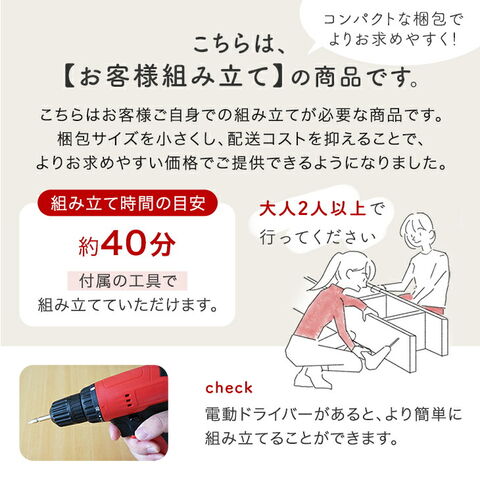 ※配送は全て宅配便(1人)での玄関渡しです。大型商品や重量商品、エレベーターの無い2階以上にお住まいのお客様は玄関口までの搬入のお手伝いをお願いしております事をご了承ください。 ※商品の寸法はロットによって、ご使用に差し支えのない程度の多少の誤差がある場合がございます。また、出来る限り実物に近い色で画像を掲載しておりますが、お使いのブラウザー及びモニターにより、実際の色と多少の差異があります。予めご了承ください。 ※手回しドライバーでも組み立ては可能ですが、ネジの本数が多いため、電動ドライバーをご使用いただくと、よりスムーズに作業していただけます。 |