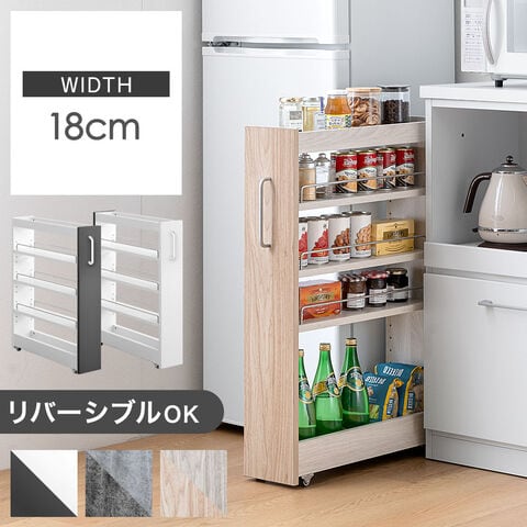 【即納】 【新発売プライス】 リバーシブル 隙間収納 ロータイプ 幅18cm キッチンラック スライド式 キャスター付 可動棚 キッチン収納 ストッカースリム 冷蔵庫キッチン 49600462〔シャビーアッシュ×ナチュラル〕
