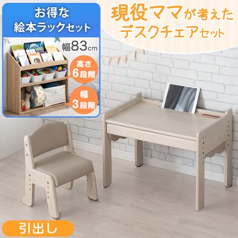 【即納】 【お得な絵本ラックセット】現役ママが考えた キッズデスク チェアセット + 絵本ラック 幅83 3段 高さ調整 デスク キッズチェア キッズ テーブル 絵本 ラック 絵本棚 49610907 〔机:ホワイトウォッシュ×グレージュ(ラック:シャビーナチュラル)〕