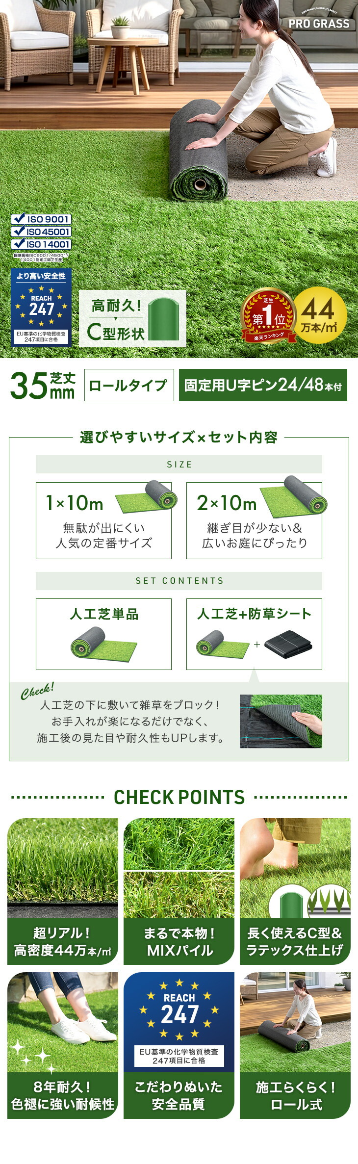 あこがれの「芝生のお庭」をお手軽に プロ仕様のリアル人工芝 PRO GRASS ・超リアル!高密度44万本/m2 ・触り心地ふかふか 芝丈35mm ・まるで本物!MIXパイル×2カラー ・葉が倒れにくいC型パイル ・抜けにくいラテックス仕上げ ・色褪せを防ぐUVカット加工 ・人工芝の本場EUの安全基準247項目に合格 ・シックハウスの国内試験もクリア ・施工らくらくロール式 ・はさみやカッターで自由な形にカットOK ・選べる防草シートセット ・ずれを防ぐU字ピン24/48本付き |