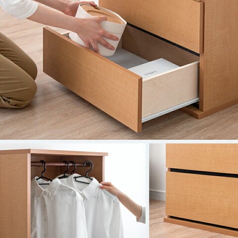 | 素材 | 天板:プリント化粧繊維板 前板:プリント化粧繊維板 側板、棚板:プリント化粧繊維板 引き出し内部:桐材 |